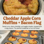 The recipe is sturdy enough for beer swilling and game day chaos. Corn muffins chock-ful of granny smith apples and sharp cheddar and topped with a crispy bacon flag. Serve with Kicked Up Kick Off Chili and let the games begin.